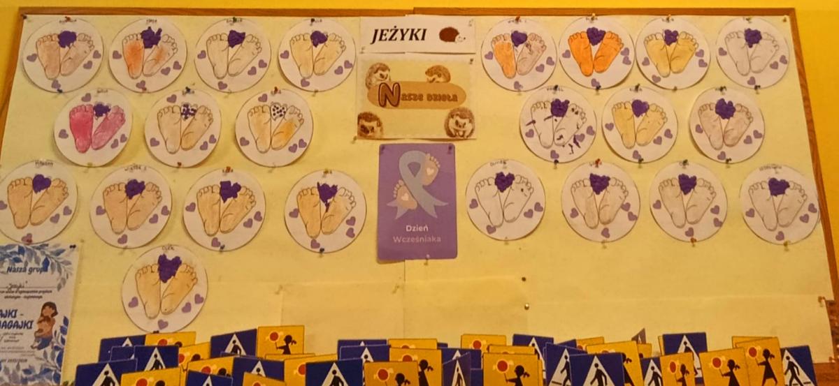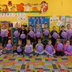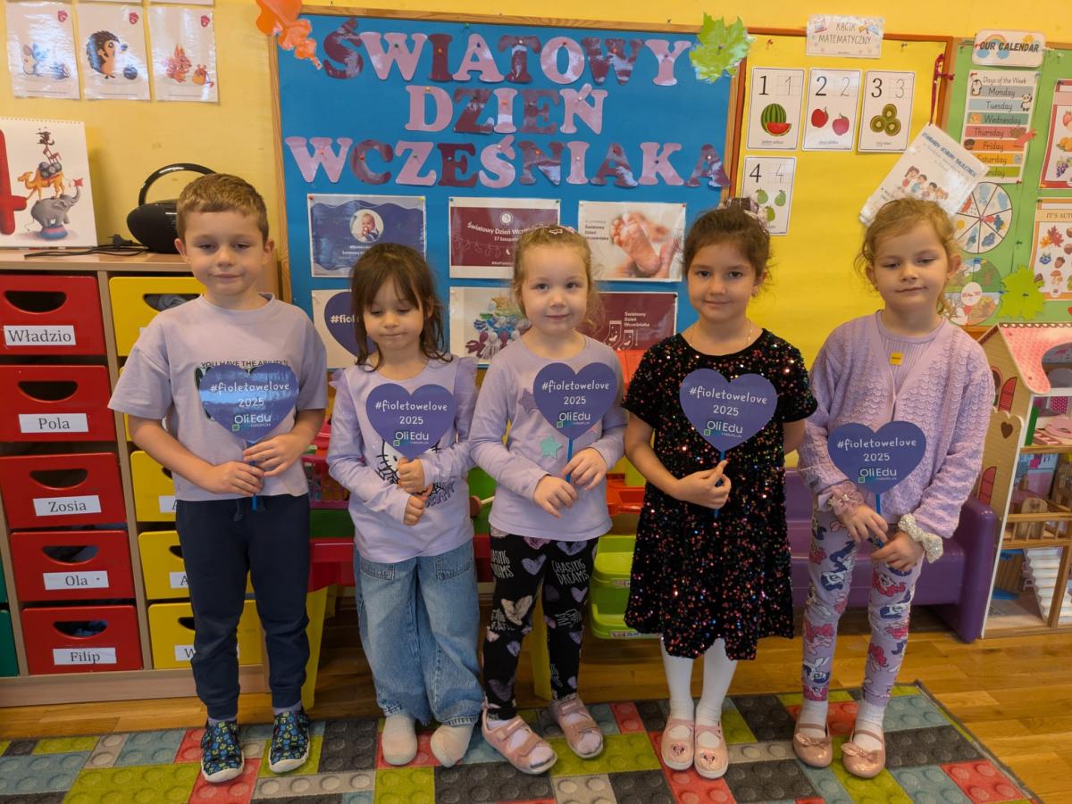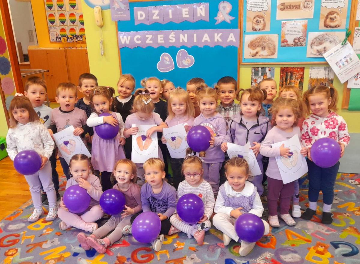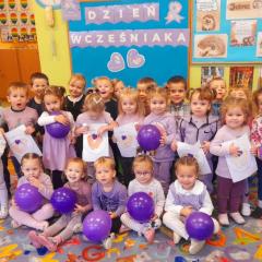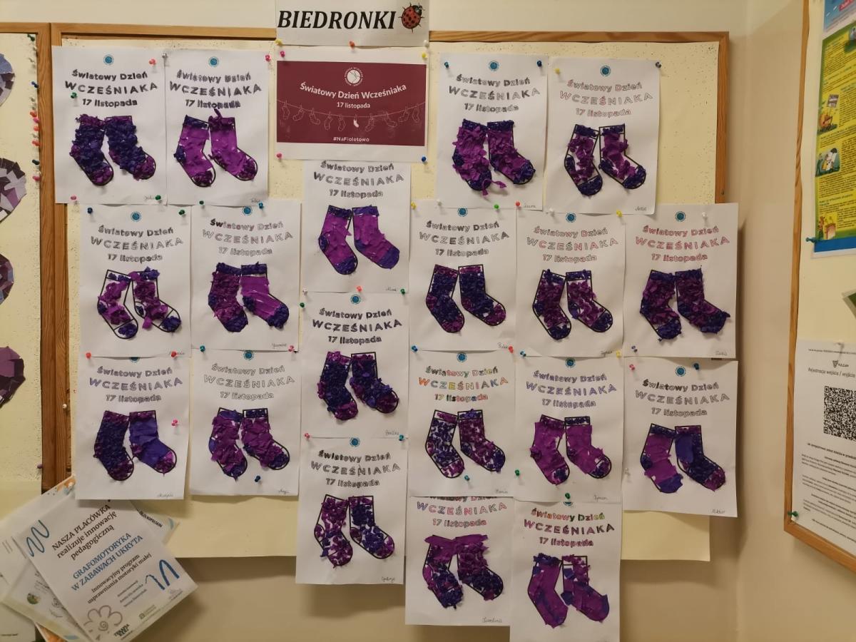 17 listopada obchodziliśmy w naszym przedszkolu Światowy Dzień Wcześniaka , włączając się tym samym do ogólnopolskiej akcji edukacyjno- zdrowotnej #fioletowelove. Dzieciom został przybliżony temat wcześniaków na podstawie opowiadania "Kangurek Oli" oraz prezentacji multimedialnej, zdjęć i ilustracji. W ramach solidarności z wcześniakami i ich rodzinami przedszkolaki przyszły tego dnia ubrane na fioletowo. Powstały ciekawe prace plastyczne : stópki niemowlęce, skarpetki,  serca i ośmiornice, symbolizujące małych wojowników.