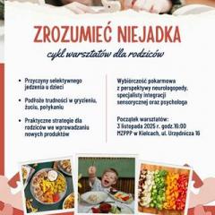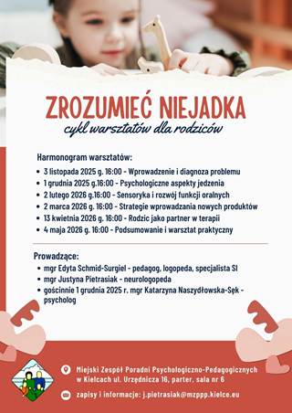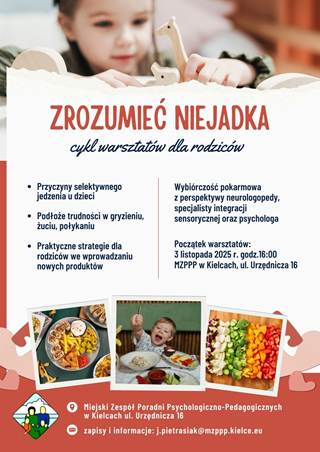 serdecznie zapraszamy rodziców dzieci w wieku przedszkolnym na cykl warsztatów pt. „Zrozumieć Niejadka”, organizowany przez Miejski Zespół Poradni Psychologiczno-Pedagogicznych w Kielcach.