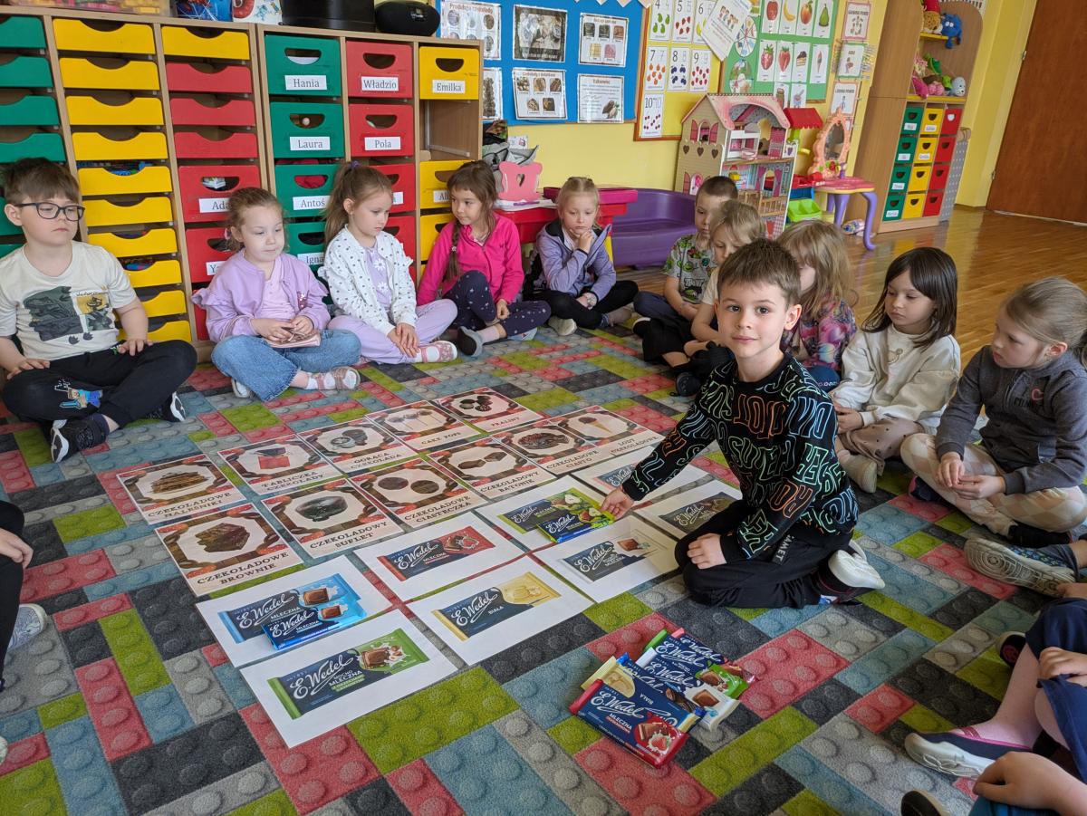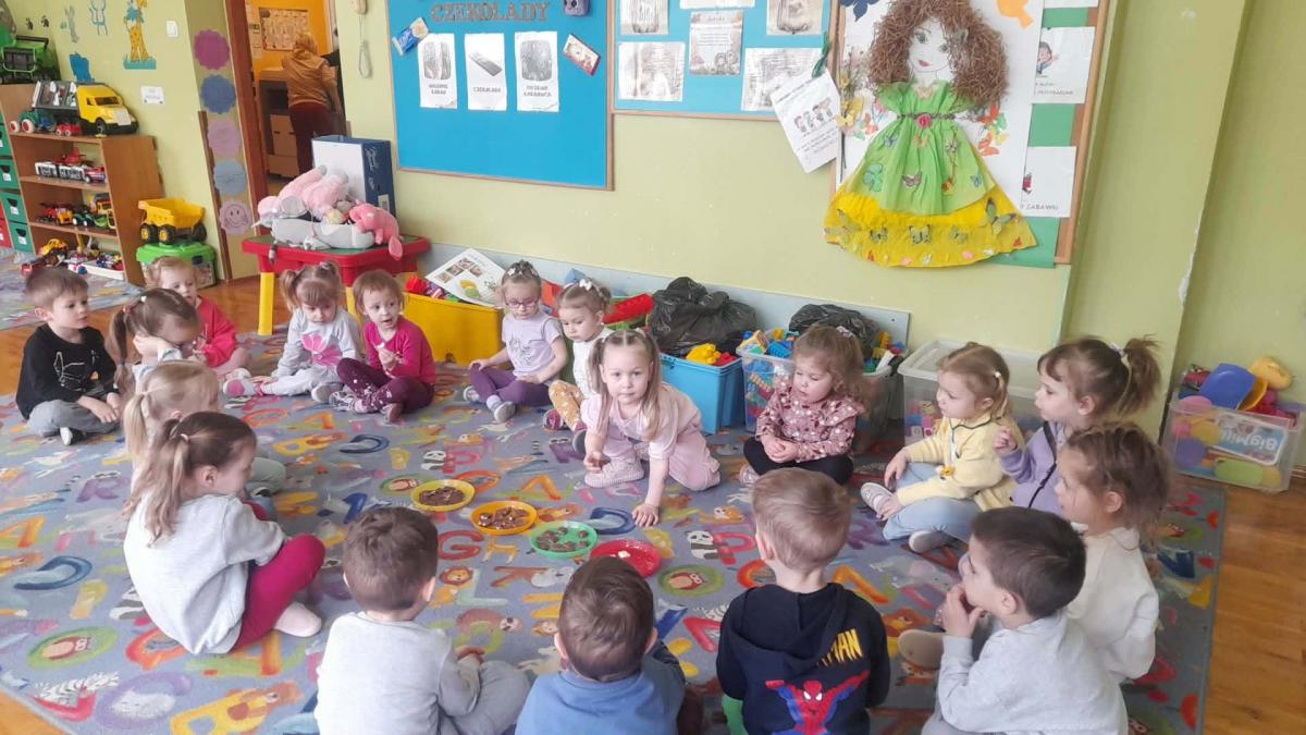 Przedszkolaki mogły zobaczyć, powąchać, dotknąć, a przede wszystkim spróbować różnych rodzajów czekolady. Dowiedziały się co jest jej głównym składnikiem oraz zapoznały się z procesem jej powstawania słuchając opowiadania "Od ziarenka do tabliczki".