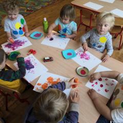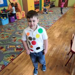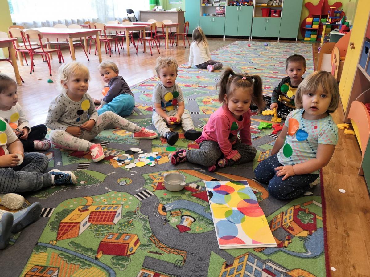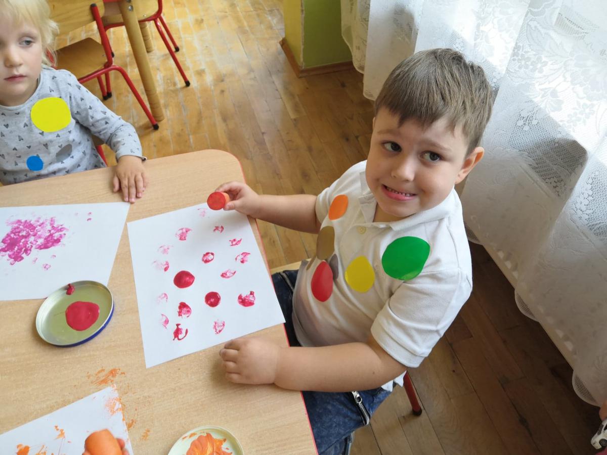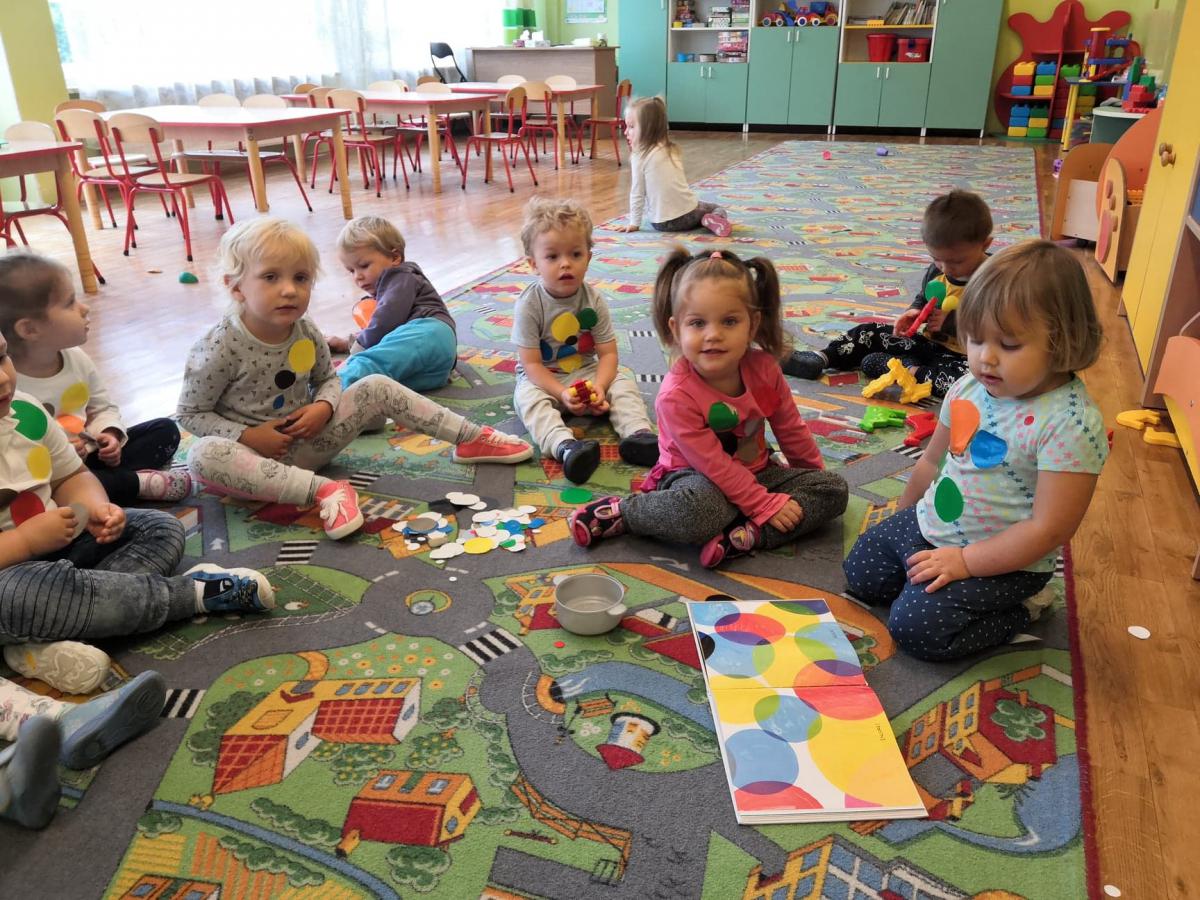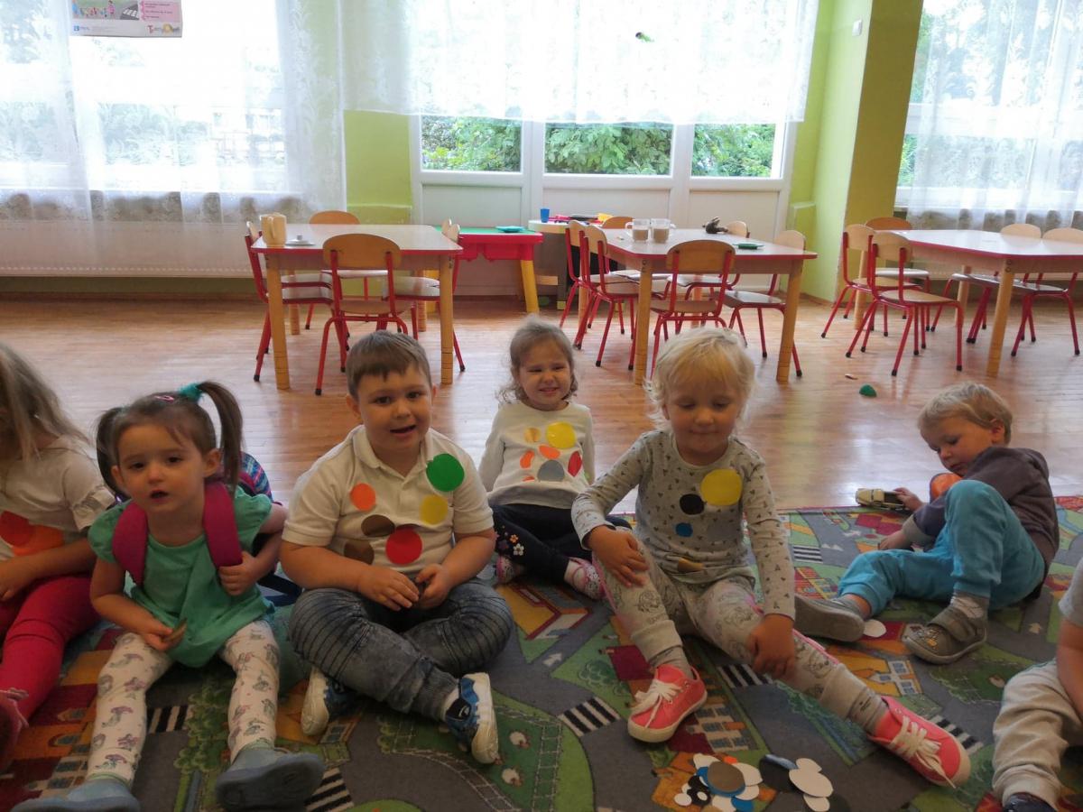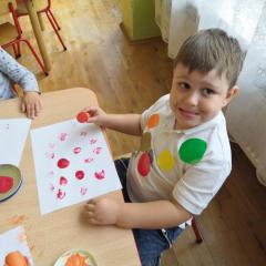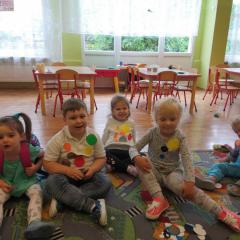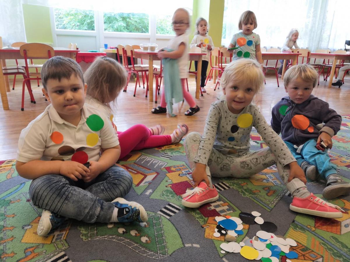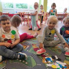 Odszukiwaliśmy kropki tam, gdzie wcześniej ich nie zauważaliśmy, porównywaliśmy ich wielkości, stemplowaliśmy marchewkowe kropki, tworzyliśmy wykropkowane ubranka.