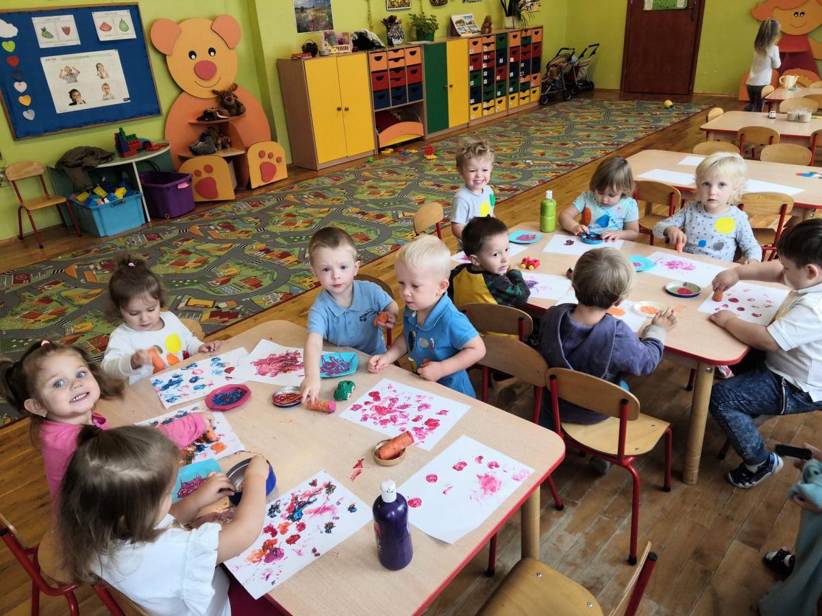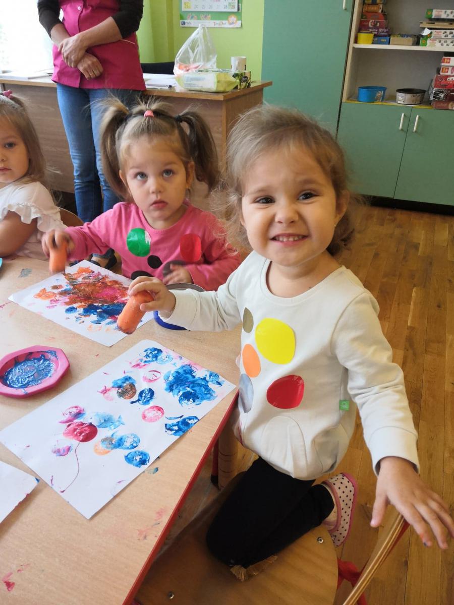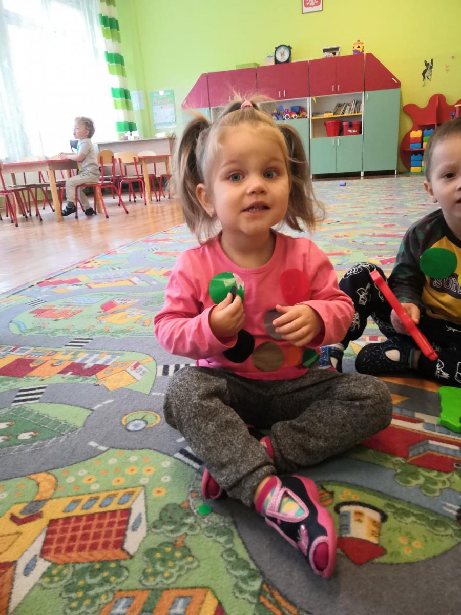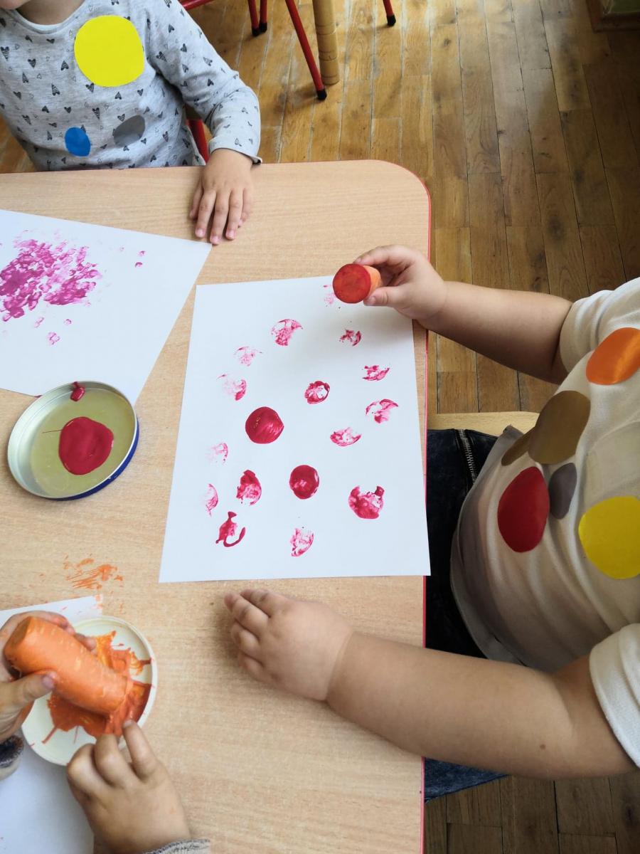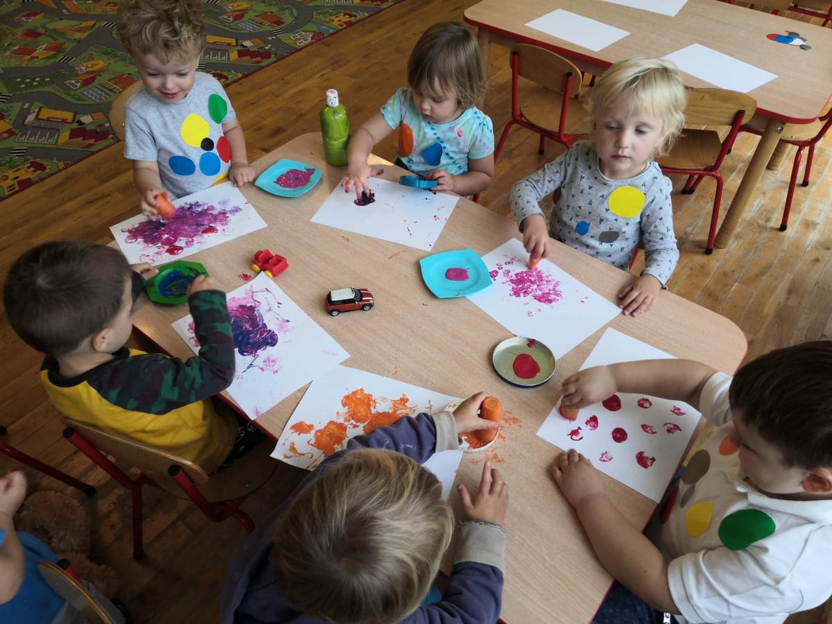 Odszukiwaliśmy kropki tam, gdzie wcześniej ich nie zauważaliśmy, porównywaliśmy ich wielkości, stemplowaliśmy marchewkowe kropki, tworzyliśmy wykropkowane ubranka.