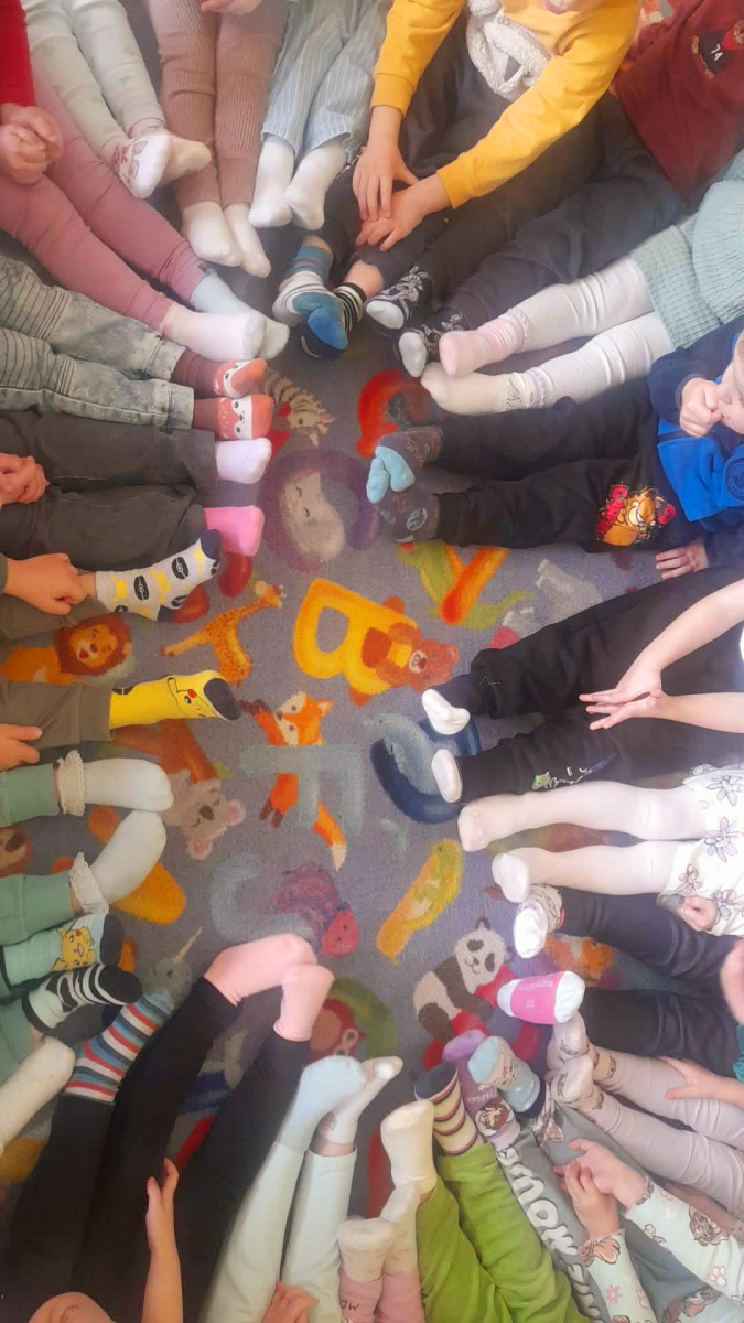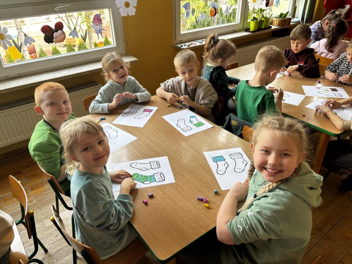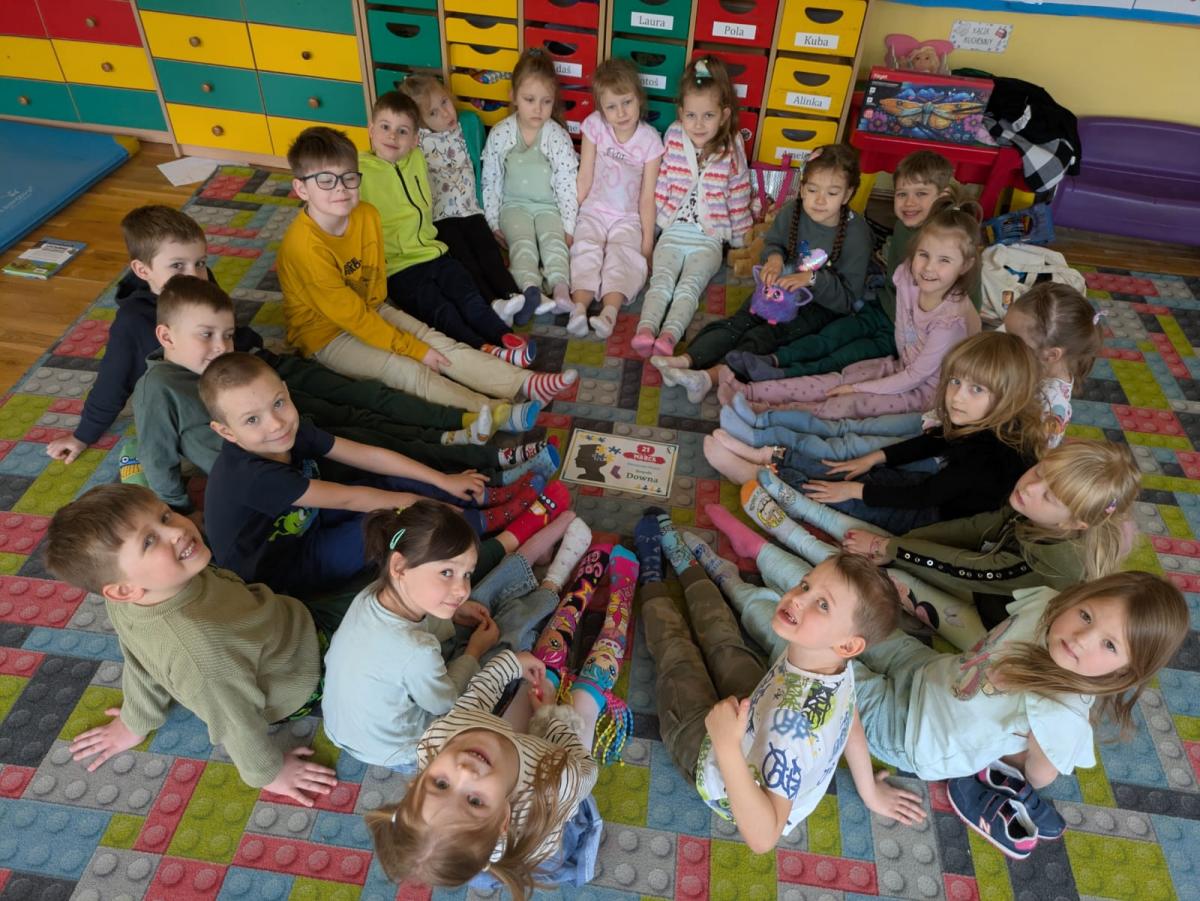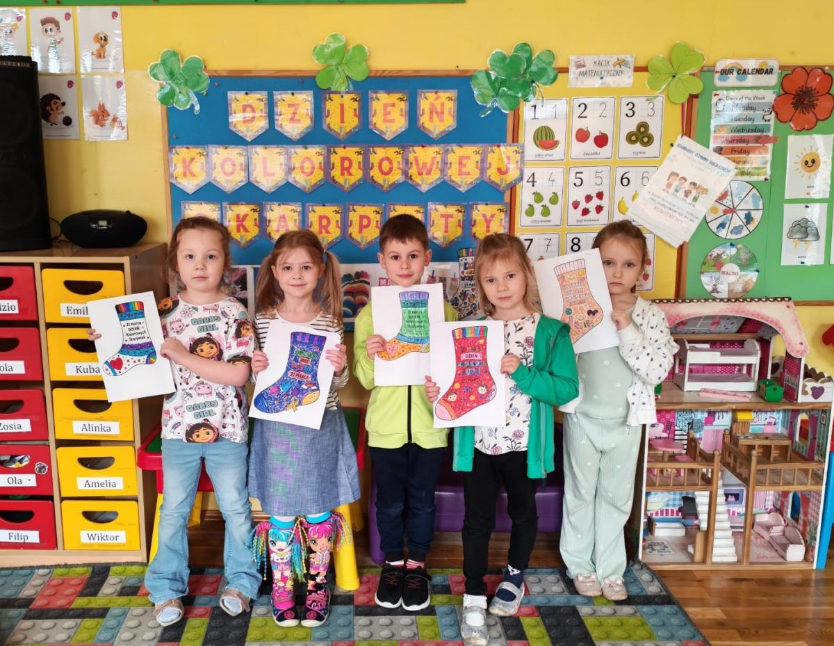 Jak co roku, nasze przedszkolaki czynnie włączyły się w obchody Dnia Kolorowej Skarpetki. Data 21 marca nie jest przypadkowa – nawiązuje do dodatkowego, trzeciego chromosomu w 21. parze, który powoduje zespół Downa. Kolorowe skarpetki stały się globalnym symbolem tego dnia. Ich różnorodne wzory i odcienie podkreślają, że każdy z nas jest wyjątkowy. Poprzez obchody Dnia Kolorowej  Skarpetki zwiększaliśmy świadomość dzieci na temat życia osób z Zespołem Downa. Łamaliśmy stereotypy, promując postawy otwartości i szacunku. Okazywaliśmy wsparcie rodzin poprzez pokazanie, że osoby z trisomią 21 mogą prowadzić satysfakcjonujące życie. Każda grupa zaprojektowała swoje skarpetki, które można oglądać na tablicach.