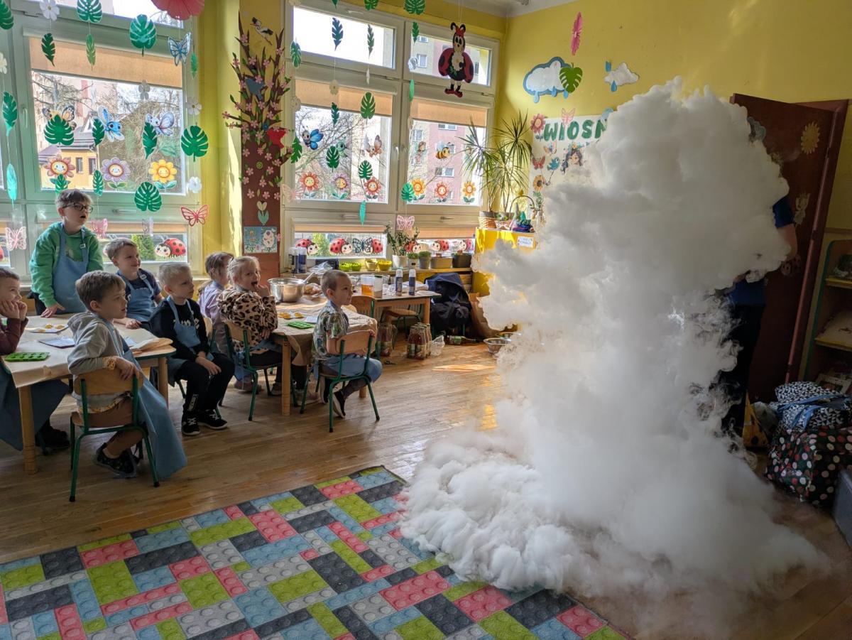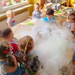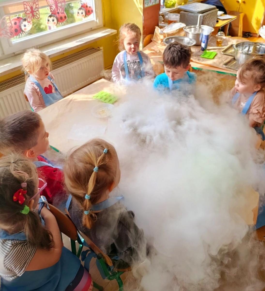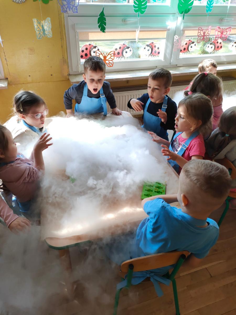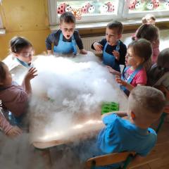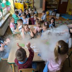 Dzieci poznały zjawisko sublimacji suchego lodu, podczas którego wydziela się dwutlenek węgla. Dzięki wykorzystaniu tej substancji przedszkolaki zobaczyły tzw. ciężki dym, który na chwilę zakrył stoliki oraz wytworzyły suchą pianę i każdy otrzymał dymiącą fryzurę.