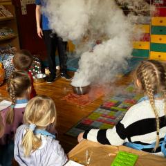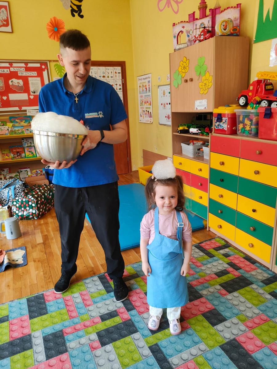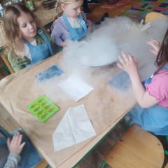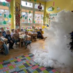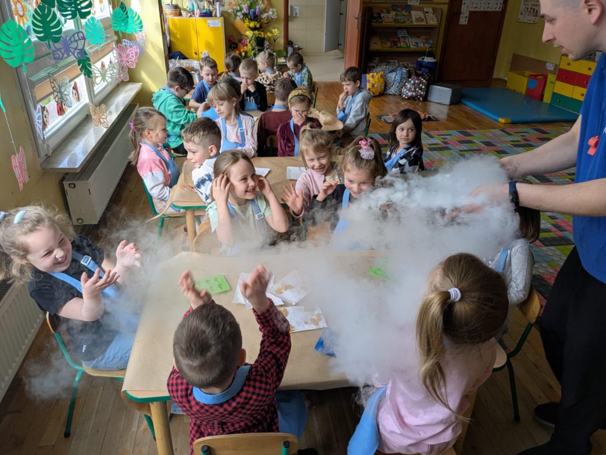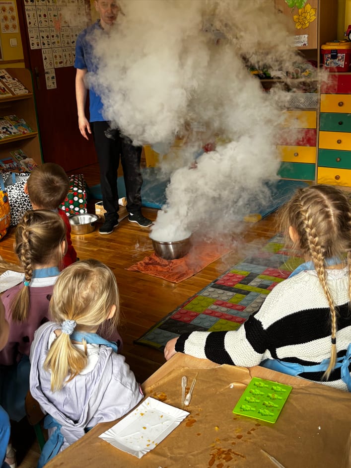 Dzieci poznały zjawisko sublimacji suchego lodu, podczas którego wydziela się dwutlenek węgla. Dzięki wykorzystaniu tej substancji przedszkolaki zobaczyły tzw. ciężki dym, który na chwilę zakrył stoliki oraz wytworzyły suchą pianę i każdy otrzymał dymiącą fryzurę.