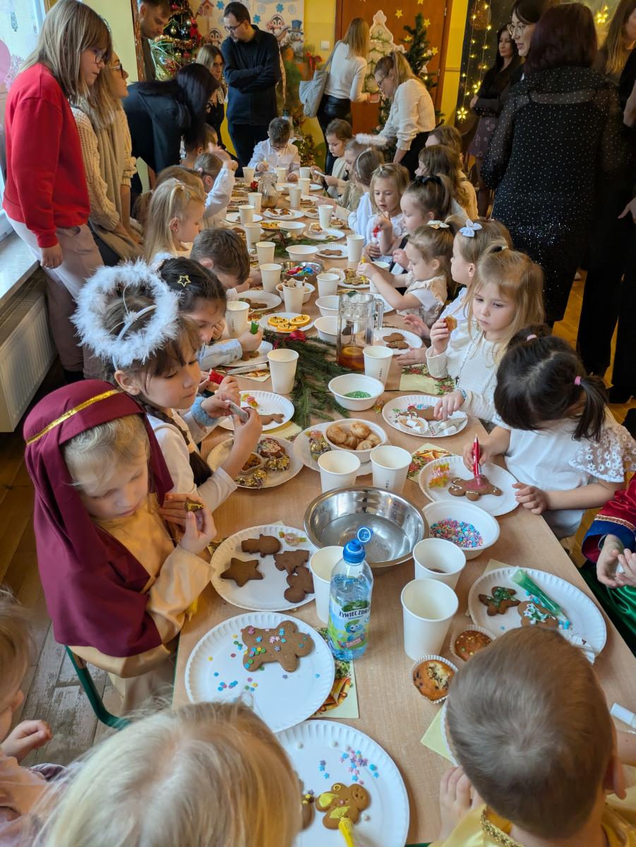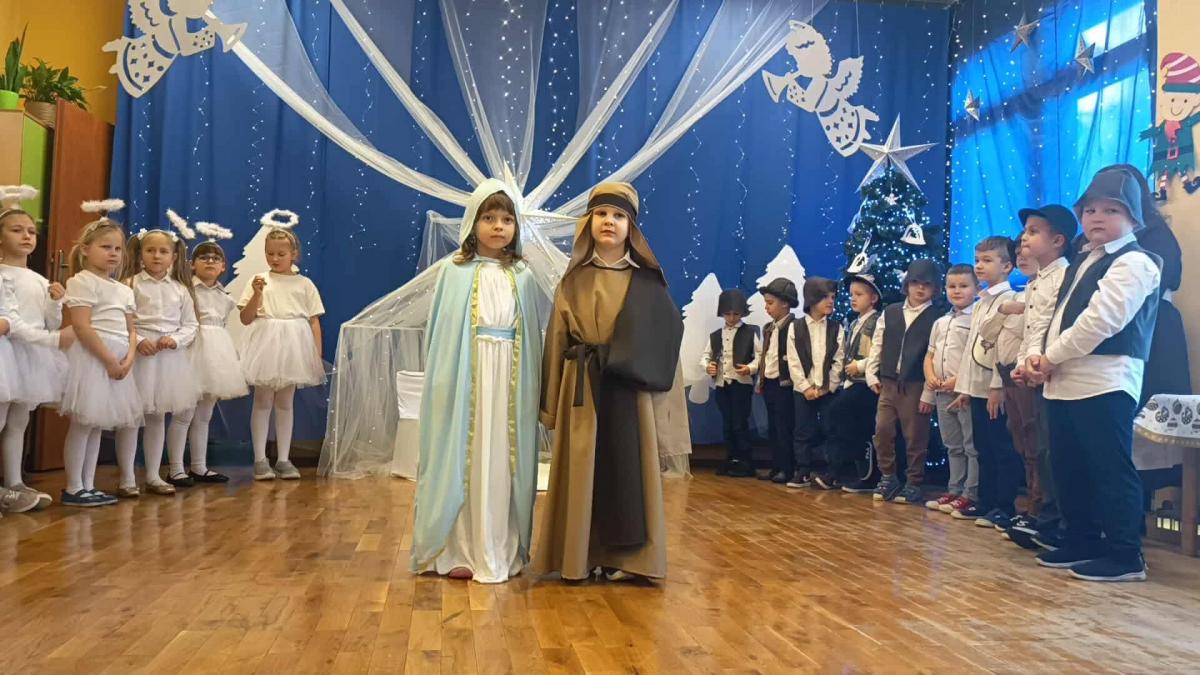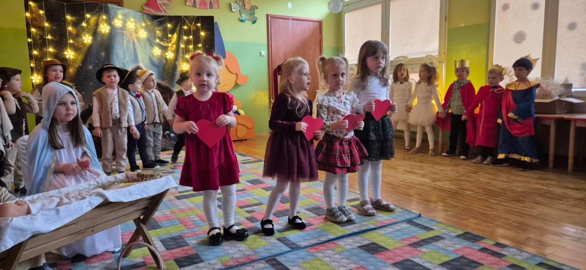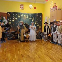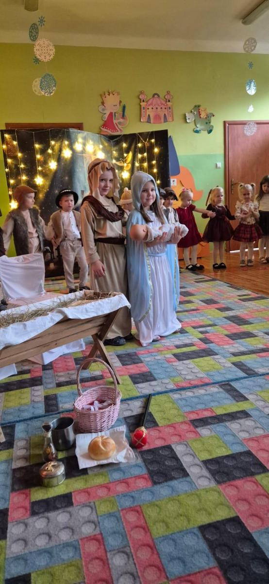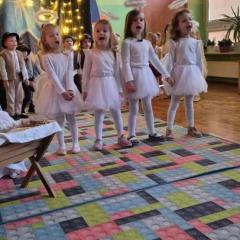 Przedszkolaki, w pięknych strojach przedstawiły historię narodzin Dzieciątka Jezus oprawioną kolędami i pastorałkami. Przepiękna scenografia nadała temu wyjątkowemu spotkaniu uroczysty i nastrojowy klimat. Po przedstawieniu dzieci dekorowały pierniki oraz składały świąteczne życzenia. Małym aktorom należą się pochwały za pokonanie tremy oraz wczucie się w role. Dziecięca interpretacja narodzin Jezusa Chrystusa, kolędy, dekoracje oraz wzajemne życzenia, które zakończyły spotkanie, pozwoliły wszystkim poczuć atmosferę zbliżających się świąt, pełną ciepła, radości i bliskości.