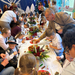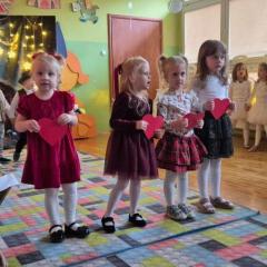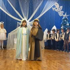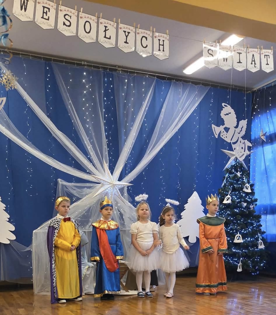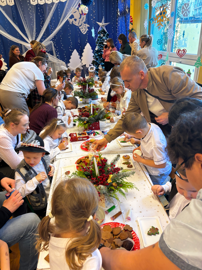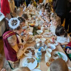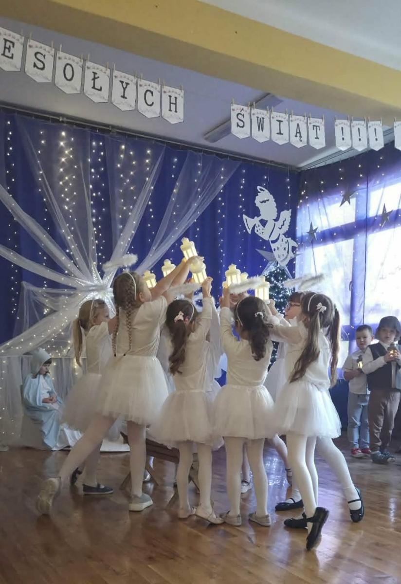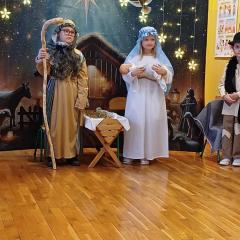 Przedszkolaki, w pięknych strojach przedstawiły historię narodzin Dzieciątka Jezus oprawioną kolędami i pastorałkami. Przepiękna scenografia nadała temu wyjątkowemu spotkaniu uroczysty i nastrojowy klimat. Po przedstawieniu dzieci dekorowały pierniki oraz składały świąteczne życzenia. Małym aktorom należą się pochwały za pokonanie tremy oraz wczucie się w role. Dziecięca interpretacja narodzin Jezusa Chrystusa, kolędy, dekoracje oraz wzajemne życzenia, które zakończyły spotkanie, pozwoliły wszystkim poczuć atmosferę zbliżających się świąt, pełną ciepła, radości i bliskości.
