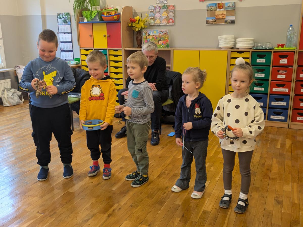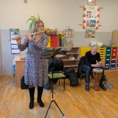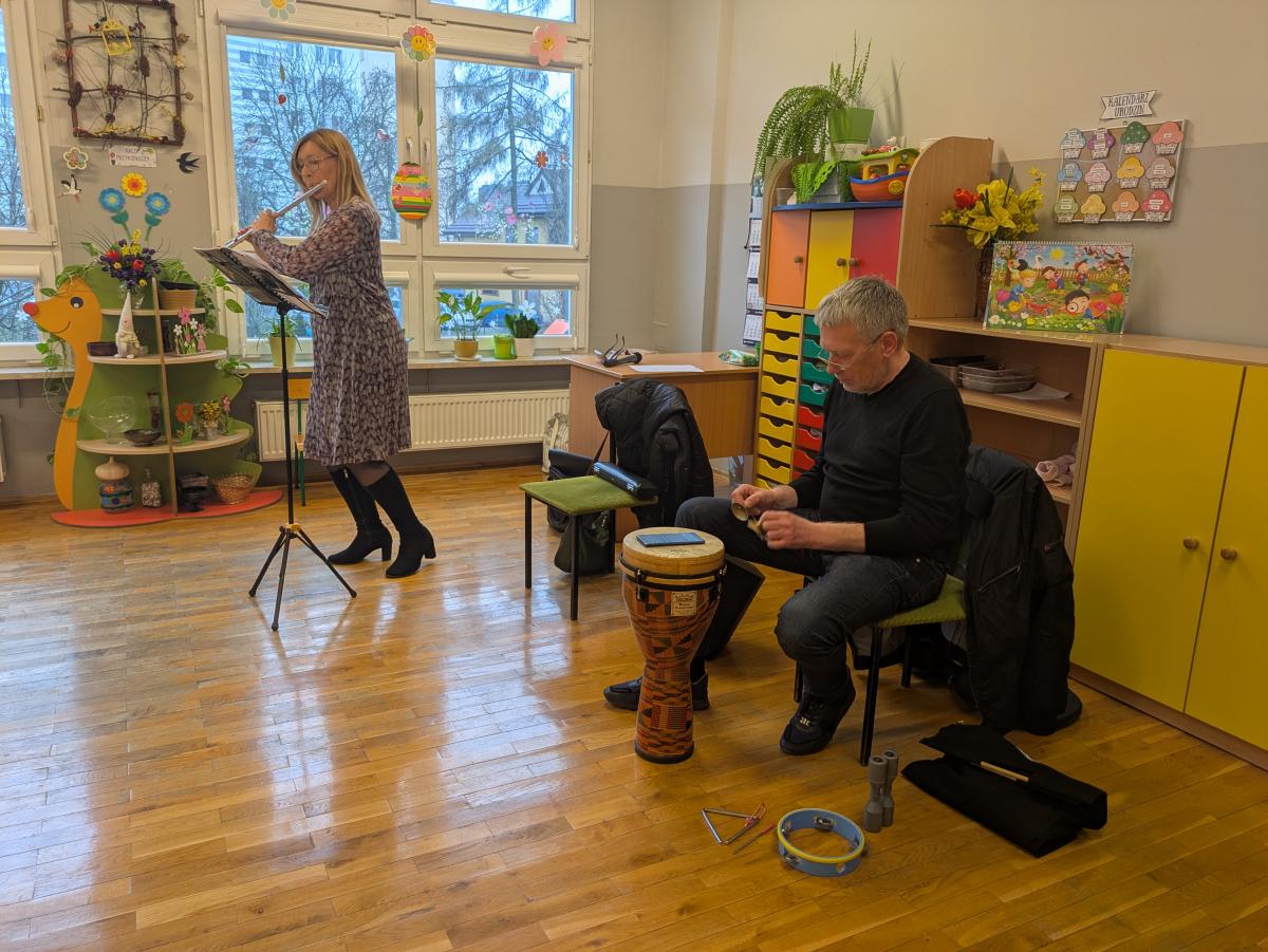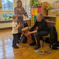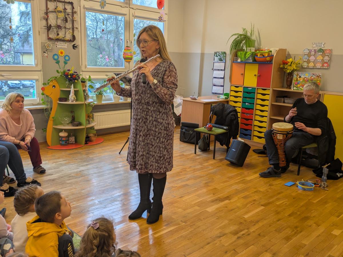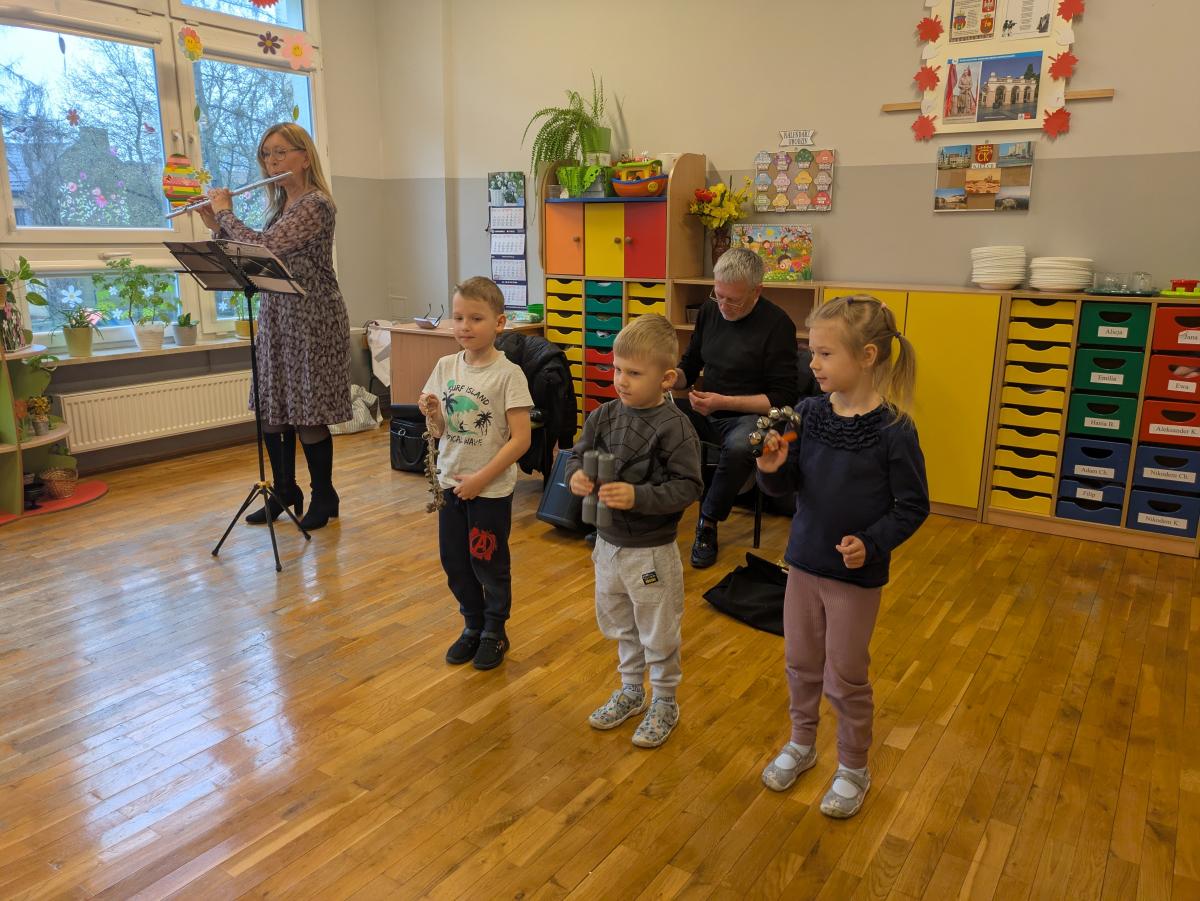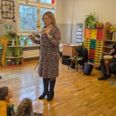Podczas spotkania przedszkolaki miały okazję poznać bliżej instrumenty dęte i perkusyjne: flet poprzeczny oraz djembę. Muzycy zaprezentowali ich brzmienie, opowiedzieli o budowie instrumentów oraz pokazali, w jaki sposób wydobywa się z nich dźwięk. Dzieci z zainteresowaniem słuchały wykonywanych utworów, a także chętnie brały udział w muzycznych zabawach. Koncert był nie tylko wspaniałą lekcją muzyki, ale również inspirującym spotkaniem ze światem sztuki.